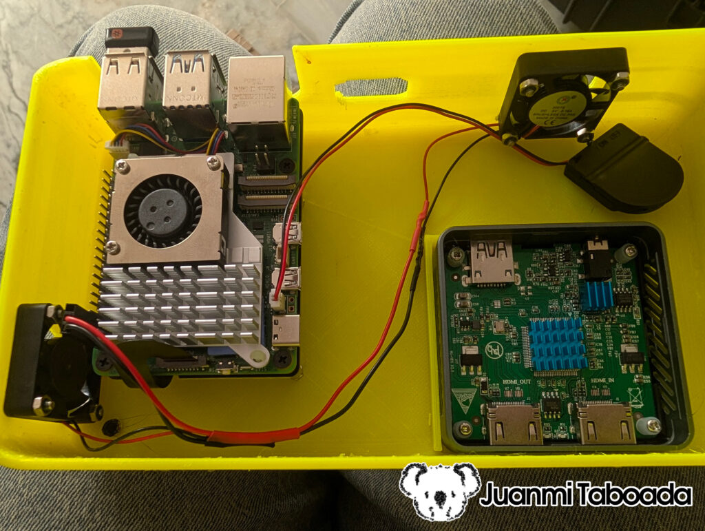 The HDMI capture card sits in its own sub-compartment inside the case, in a separate 3D-printed enclosure mounted next to the Raspberry Pi. This keeps it thermally isolated (the capture card has its own heatsink, I got from a Pi kit) and mechanically secure.