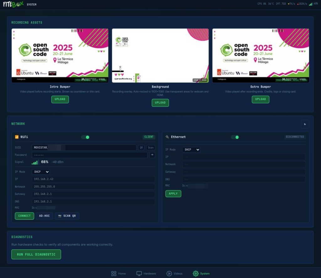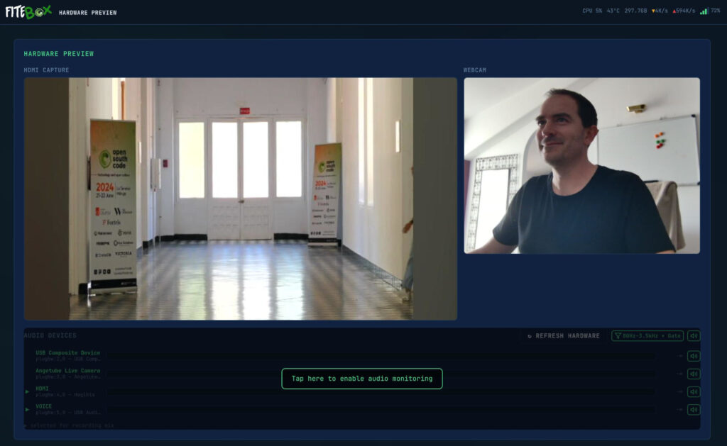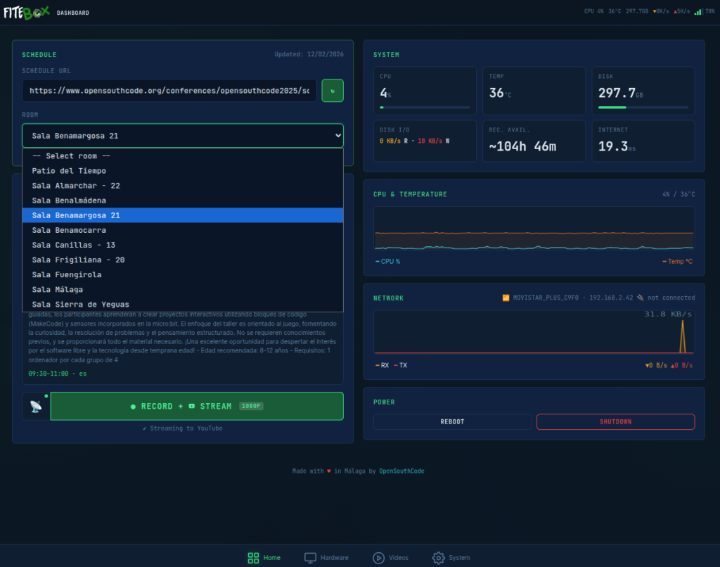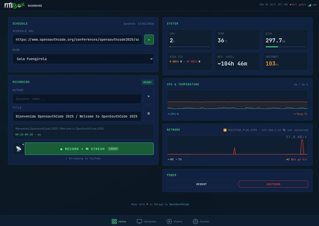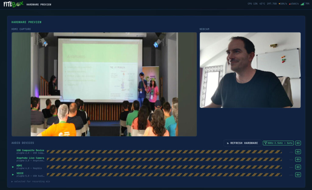 In my experience working with OpenSouthCode (an annual Open Source conference in Málaga, Spain), I learned that recording conference talks should not cost 40% of your event budget. FITEBOX is my answer to that problem: a Raspberry Pi 5 box that records talks autonomously, composite video with slides and speaker camera, mixed audio, branded overlays, and optional live streaming, all managed from a tiny OLED screen or a web UI on your phone.