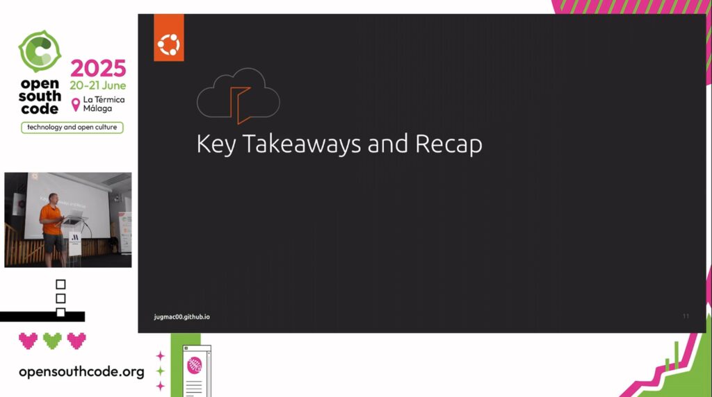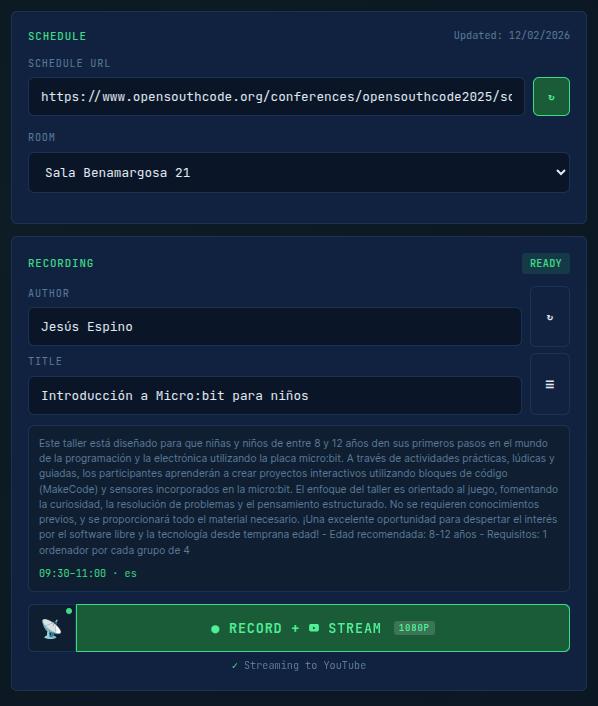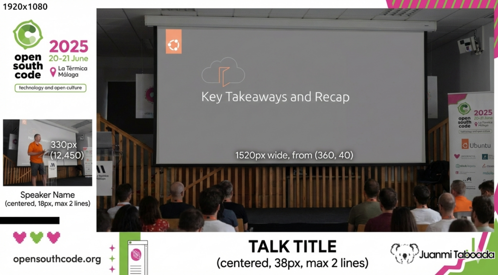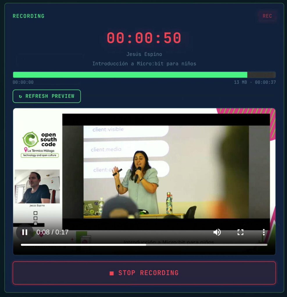 OpenSouthCode is a community conference. We are a non-profit association with no steady income. We depend entirely on sponsors who support us each year. For years, we hired professional recording crews to capture the talks across multiple rooms. The cost was high. At its peak, video recording consumed nearly 40% of the total event budget. That is money that should go to catering, venue, and making the conference better for attendees. It was unsustainable.