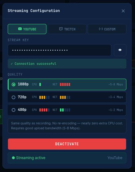 The critical detail in the live phase is that the video uses -c:v copy – zero CPU. The Pi 5 cannot sustain two simultaneous 1080p encodes (recording + stream). By copying the already-encoded video from the MKV and only re-encoding the audio, the streaming overhead is negligible.