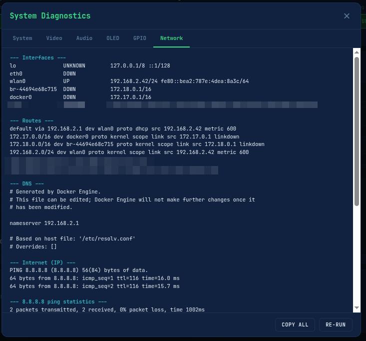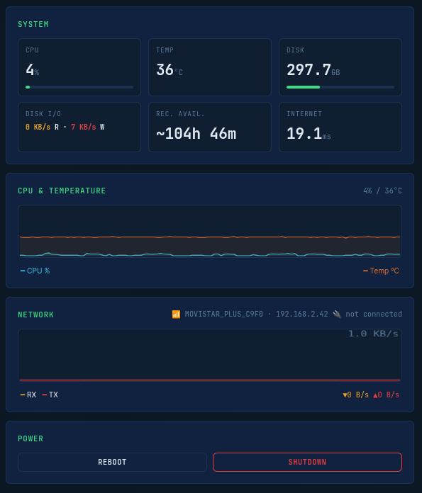 psutil.cpu_percent(interval=None) instead of interval=1 (eliminates a 1-second blocking call)/sys/class/thermal/thermal_zone0/temp (instant file read) instead of vcgencmd subprocesscollections.deque(maxlen=120) for CPU/temp/network metrics (~2KB memory). Sent to the browser on WebSocket connect for instant chart restoration.The Docker entrypoint (entrypoint.sh) traps SIGTERM to ensure clean shutdown: