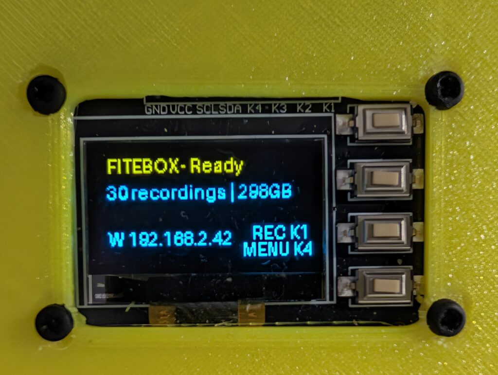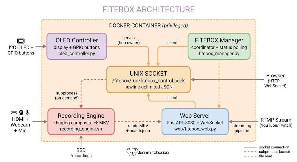 In 2025, David Santos and I decided to fix this. David had the vision for the hardware: a small box based on a Raspberry Pi 5 with an OLED display and physical buttons, capable of autonomously recording a conference room. He designed the hardware architecture, selected the components (the SSD1306 OLED, the GPIO buttons, and the capture card, which was the same one used at FOSDEM conferences), and built the first physical prototype, including the 3D-printed enclosure. The hardware foundation of FITEBOX is the result of David’s work.