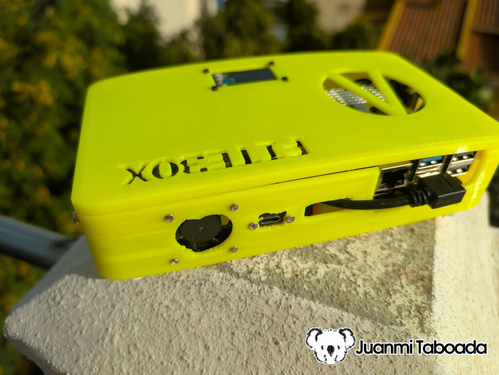 David Santos designed the FITEBOX enclosure, and we printed it on our 3D printers. The STL files are included in the repository. The design has some notable features that are visible in the photos: