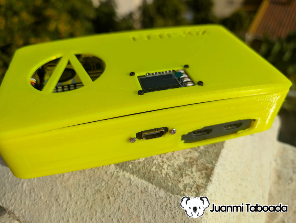 Route cables neatly, verify the 30mm exhaust fans are connected and oriented correctly (blowing out), and close the enclosure. Verify that the OLED display is visible and all buttons are accessible through the top panel cutout.