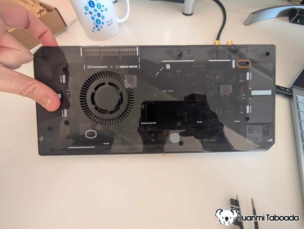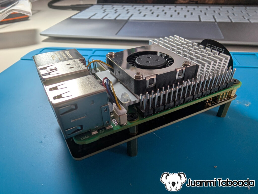 This is the core of the build. The Raspberry Pi 5 sits at the top, with the PCIe NVMe HAT mounted under via brass standoffs, connected to the Pi’s PCIe connector via an FPC ribbon cable. The NVMe SSD slots into the HAT, and the ARCTIC M2 Pro heatsink goes on top of the SSD.