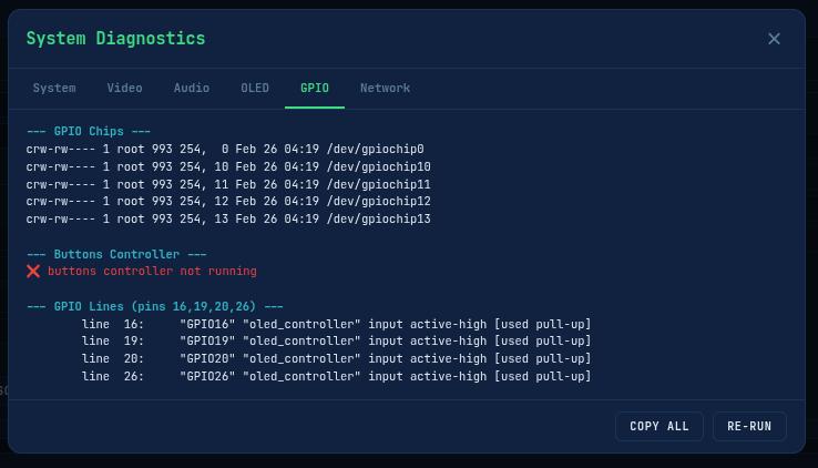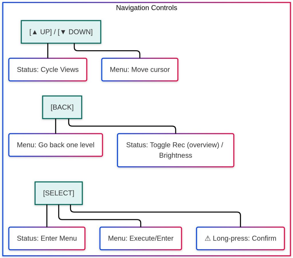 The module fits into a single rectangular cutout in the top panel of the case, secured with 4 screws. The buttons face outward and are easily accessible. No external resistors needed – the software uses the Pi’s internal pull-up resistors via gpiod.