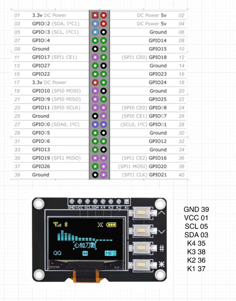 Why the OLED module with integrated keys? This is an elegant find: a single PCB that combines the SSD1315 OLED display (128×64, I2C) with 4 tactile buttons, all soldered to the board. One module, one cutout in the case, one clean panel. The buttons connect to GPIO pins (BCM 26, 16, 20, 19) and the display connects via I2C (SDA/SCL). The whole thing costs 2,22€.