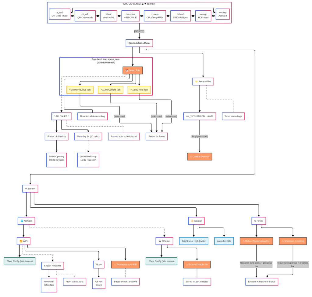 We chose a clean, permanent build philosophy. No breadboards, no flying Dupont wires, no tape. This is equipment that a volunteer will handle at a real event, and it must work reliably. If something comes loose during the conference, you lose all recordings for that room for the rest of the day.