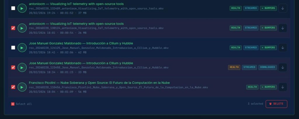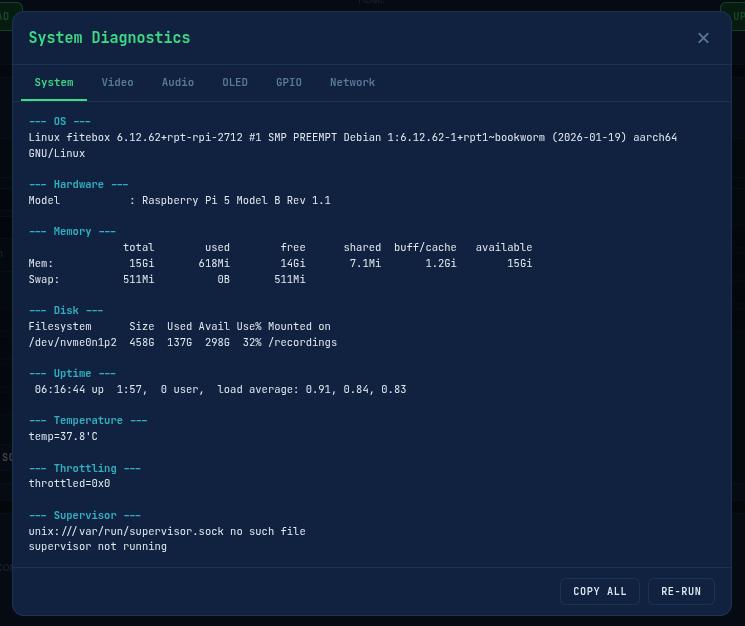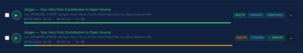 I recovered my motivation and went deep. Weeks of development followed 36 versions of the recording engine, many manual tests on real hardware, and a complete web interface with real-time monitoring. FITEBOX grew from a rough experiment into a professional-grade recording and streaming system.