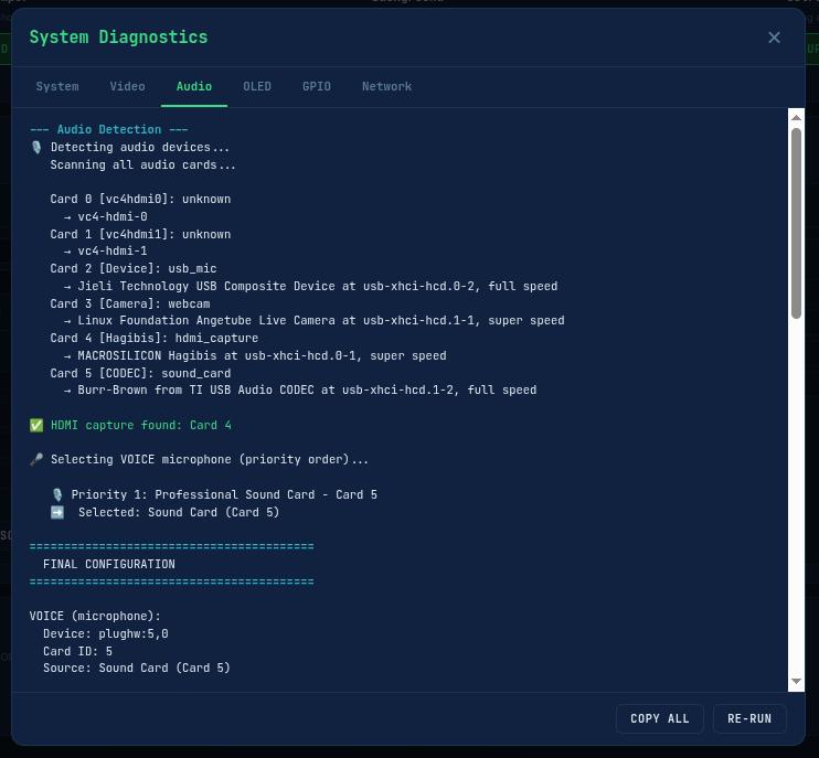 Audio detection works the same way. The detect_audio.sh script classifies ALSA cards into categories: hdmi_capture, webcam, sound_card, usb_mic, generic_usb. It then force-unmutes all capture channels, because some USB audio cards ship with capture channels muted by default: