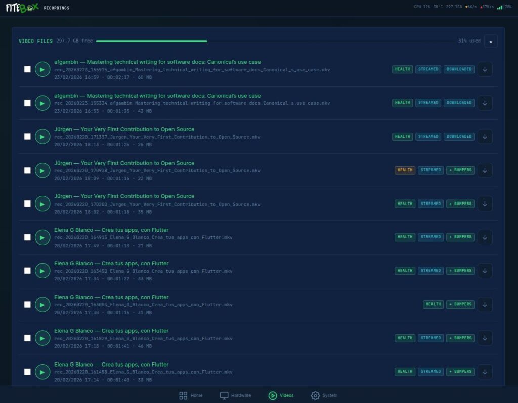 If you run a community conference, a hackerspace, a user group, or any association that records events, give FITEBOX a try. Clone the repo, build a box, and let me know how it goes. Pull requests are welcome.